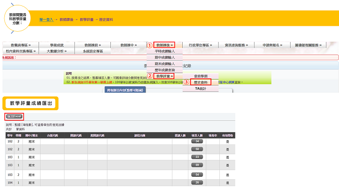 102-2學期起之歷史資料可進入單一登入後,點選教師課後-教學評量-歷史資料即可下載教學評量結果(路徑如圖示);如需102-1前歷史資料,煩請教師填寫【教學評量結果報表申請單_教師本人申請】教學評量結果報表申請單 (教師本人申請),遞送送至教學發展中心,我們會立即為您處理。